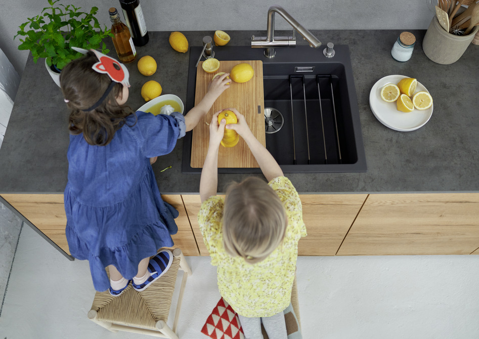 Milky patches can soon show up on your stylish dark sink. These are caused by limescale deposits, which can vary hugely from place to place, and depending on the state of your water pipes. Such stains also pick up deposits from substances like tea or coffee, and are thus responsible for discolouration. But all this isn’t as bad as it sounds. Luckily, BLANCO ANTIKALK, a little vinegar-based cleaner or diluted citric acid and hot water can come to your rescue. The limescale will dissolve if you clean your kitchen sink thoroughly with these substances. If you don’t want to constantly have to contend with unsightly marks, be sure to dry your sink off with a microfibre cloth after every use. Doing this will prevent the limescale from occurring in the first place.