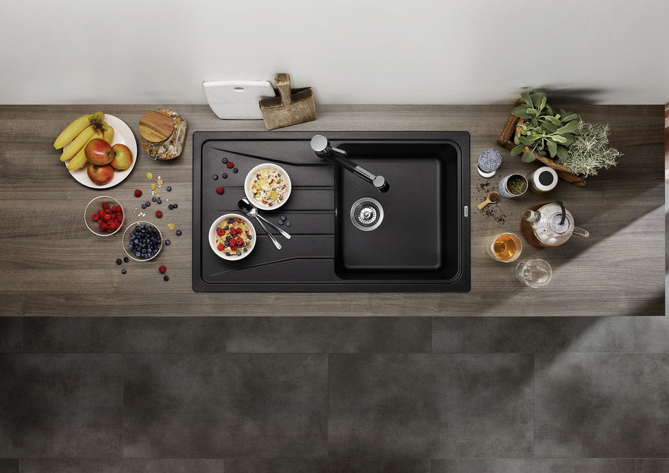Milky patches can soon show up on your stylish dark sink. These are caused by limescale deposits, which can vary hugely from place to place, and depending on the state of your water pipes. Such stains also pick up deposits from substances like tea or coffee, and are thus responsible for discolouration. But all this isn’t as bad as it sounds. Luckily, BLANCO ANTIKALK, a little vinegar-based cleaner or diluted citric acid and hot water can come to your rescue. The limescale will dissolve if you clean your kitchen sink thoroughly with these substances. If you don’t want to constantly have to contend with unsightly marks, be sure to dry your sink off with a microfibre cloth after every use. Doing this will prevent the limescale from occurring in the first place.