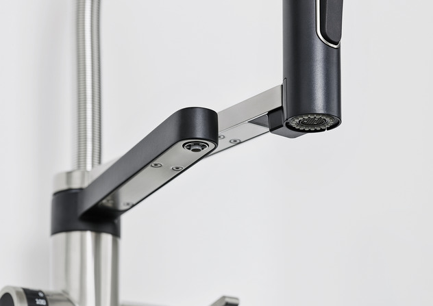 - Spout swivels 180° on a flexible hose with magnetic dock, for cleaning all areas of the sink
